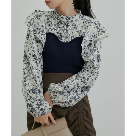 ニットビスチェはリブ編み、ブラウスはフリルデザインで1枚で着映えする仕様になっています◎
