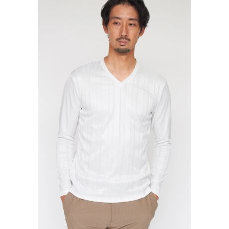 光沢感のあるランダム針抜きテレコ素材を使用したVネック長袖Tシャツです。