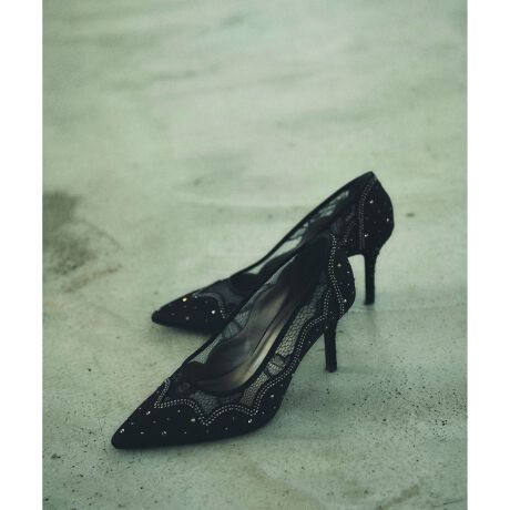 [型番:0123371501]ラインストーンとパールを散りばめたフェミニンパンプス。スカラップのカットとレースで表現したシアーな透け感が映える、エレガントなデザインです。すっきり綺麗なレッグラインを叶えてくれる、ポインテッドトゥ仕上げ&華奢なヒール仕上げ。華やかなドレスアップスタイルにも負けない存在感があり、オケージョンシーンにぴったりな一足です。