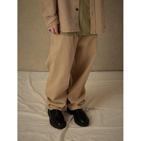 90年代のクラシックなスタイルを現代的に解釈し、ハイライズとテーパードレッグが特徴。リラックスしたルーズなスタイルで履けるようにデザインにされているのでスニーカーとの相性は間違いありません。トラウザーポケットやタックが施されているので、トップスをタックインや丈の長さに変化を加えることで異なる印象を与えることも出来ます。このカラーはチノやワークパンツのような雰囲気を感じさせてくれるので着回しの効く1本です。