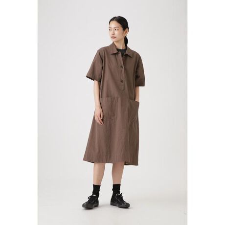 コットンリネンを使用したドレス。仕上げで生地に特殊な洗い加工を加えることで独特な凹凸とタフなハンドリングを作り出した清涼感ある素材。ゆったりとした身幅から自然に広がるフレアが印象的なシルエット。