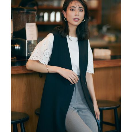 スッキリとしたVネックのカットラインがきれいなノーカラージレはスタイリングの雰囲気を変えてくれるレイヤードアイテム。様々なトップスに合わせて自由にアレンジが楽しめます。腰周りを隠してくれるレングス感もうれしいポイント。同素材のボトムと合わせてセットアップとしても対応可能です。カラーは、シックで万能なブラック(#005)、優しい印象のベージュ(#033)、爽やかで清涼感のあるホワイト(#001)の3色展開です。
