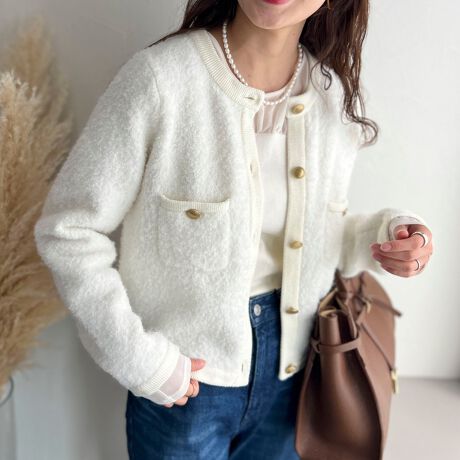 ・ふわふわシャギー素材のジャケット風のクルーネックカーディガン