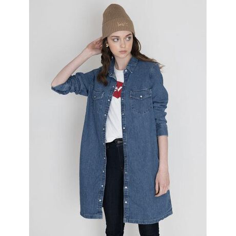 定番デニムシャツの裾を伸ばした、着回し抜群のドレス。
