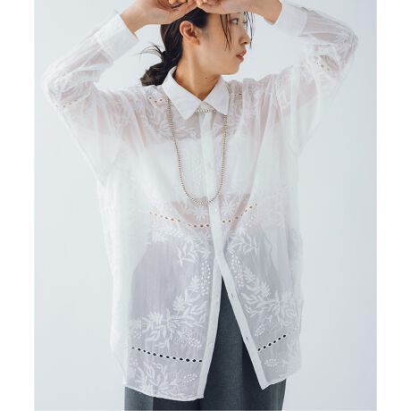 TOLIGHTデザイナー青山氏のドローイングを、刺繍で表現した素材で作ったシャツは、レースのハンカチーフがつながったような、繊細なデザインです。