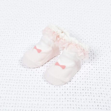 靴を履いたように見えるデザインとつま先のリボンが可愛い女の子用カップソックス。