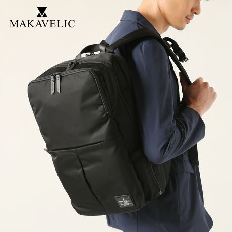 黒で統一されていますが、持ち手の表部分とベルト先端にはヌメカウレザーを使用し、ジップ持ち手にはラバー素材を用いるなど異素材を合わせてたデザインで、さりげない高級感を感じさせます。マキャベリックのロゴが入ったマットな質感のメタルプレートもポイントです。