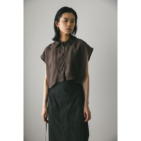 WHT:モデル身長165cm(FREEサイズ着用)BRN:モデル身長168cm(FREEサイズ着用)生地の持つ膨らみとシアーの艶が上品なシャツベスト。フロントボタンをバスト下まで施し、スリット仕立てに仕上げたことでスタイルアップも叶える一枚に。フロントボタンディテールがコーデのポイントになり、いつものコーデにプラスするだけでおしゃれ見えするシャツベストです。透け感あり、ストレッチなし。【お手入れ方法】手洗い可