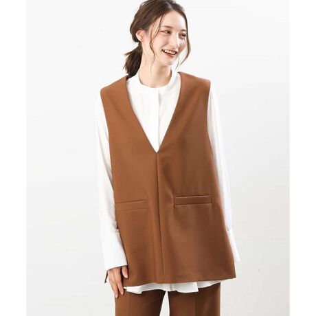 ベストなのでインナーによって雰囲気を変えた着こなしが楽しめます。ニットを入れればカジュアルに、ブラウスならきれいめな印象でお仕事シーンにも活躍してくれます。Vネックなので、ハイネックやタートルネック、モックネックなどのやや詰まり気味のネックのいトップスと合わせるとバランスよく決まります。同素材のパンツもご用意していますので、セットアップでも着用いただけます。