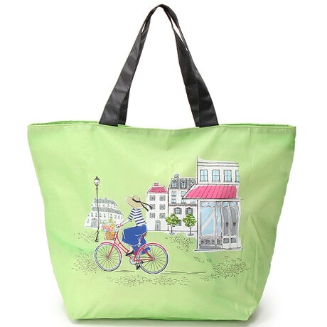 カジュアルライフを楽しむ女性がモチーフの、裏表両面プリントのエコバッグです。