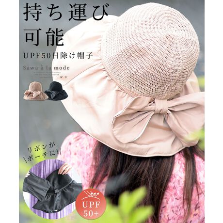 【帽子】 小物 ハット 黒 ブラック ベージュ リボン 紫外線カット UPF50 UVカット 収納