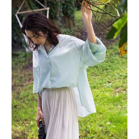 ■デザイン1 枚映えするスキッパーブラウスです。ゆったりとしたシルエットで着こなせるカラーレスのブラウスは、たっぷりと繊細にギャザーを寄せ美しい曲線をつくったクチュール感のある後ろ姿と立体的な袖のパターンワークが一味違った洗練された印象に仕上げています。前後差のある着丈で、直線的な裾のラインと斜めに切った脇のシルエット、深めのスリットがこなれ感と今どき感をプラスしています。立体感のあるフォルムは着用するだけで抜け感のある女性らしいシルエットが叶います。