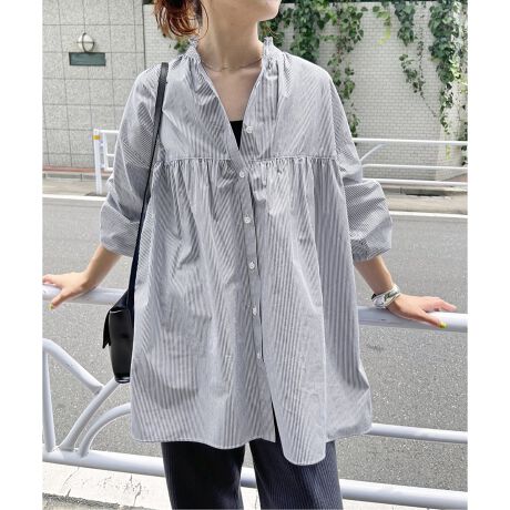 女性らしいフリルディテールながら、70/-コットンタイプライターのストライプ柄を選んで、甘くなりすぎないブラウスに仕上げました。