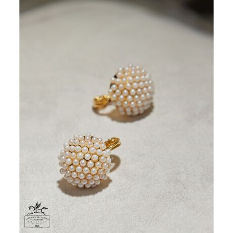 2004年にイタリアより入荷したメタル(錫合金)を使用し、半円のゴールド土台に小粒のパールを施したボタン。上品ですが存在感のあるテクスチャーがポイントです。存在感のあるデザインでぱっと耳元が華やかになるデザインです。