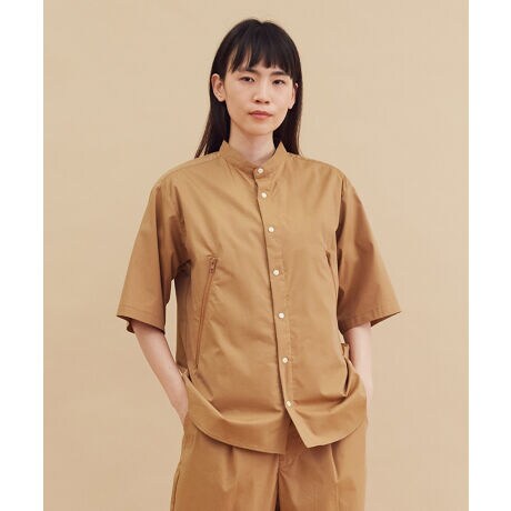ベーシックなシャツのボディーをベースにしながらも衿まわりをスタンドカラーにすることでスッキリとした印象をつくっています。フロントのプラスナップと大きなジップ開きのポケットがシンプルな中にも程よいアクセントをつくっています。ポケットの布地がメッシュになっているなど見えない細部にまでこだわりが満載です。