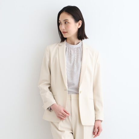 細めのテーラード衿がスタイリッシュな印象の1つ釦のテーラードジャケットです。