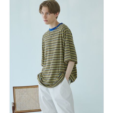 スラックスと合わせたクリーンな着こなしや、ラフにデニムやイージーパンツ、スニーカーを合わせた着こなしもおすすめ。ランダムなボーダー柄と首元の配色部分がアクセントとなる為、一枚着でも単調にならずおしゃれにまとまります。シンプルになりがちな夏の着こなしに新鮮さを与えてくれる一着です。