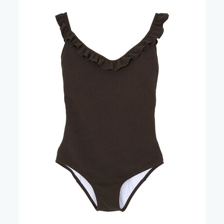・デコルテラインから背中までのミニフリルデザインと立体感のある素材がポイントのワンピース水着。