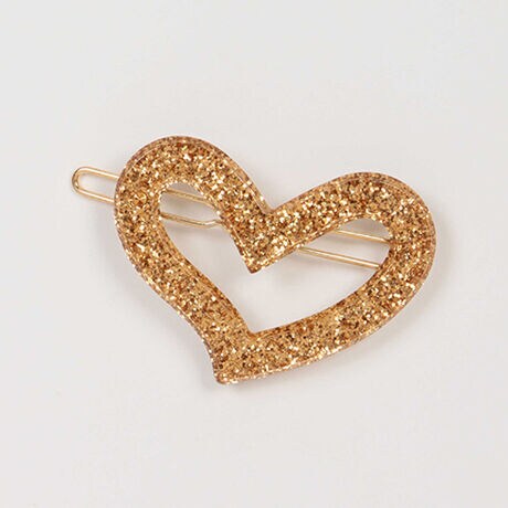 ラメが煌めく華やかさ満点のヘアピンです。大きめのハートモチーフで女の子らしさが倍増します。ピン部分が大きく開くので、髪の毛が多いお子さまにも安心して使えるアイテム。デイリーユースはもちろん、ちょっと特別な日の装いにもぴったりです。