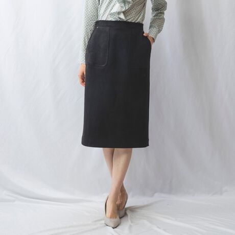 ソフトな起毛感のあるスエード調生地で仕立てたタイトスカート。機能性も兼ね備えた大きめのポケットもアクセントをプラス。ゴールドのメタルパーツもさりげないポイントです。バックファスナー仕様で着替えも楽にすることができます。着こなしも品良くまとめてくれるタイトシルエットを採用。後ろ裾にはスリットを入れることで、足さばきもスムーズで快適に着用出来ます。