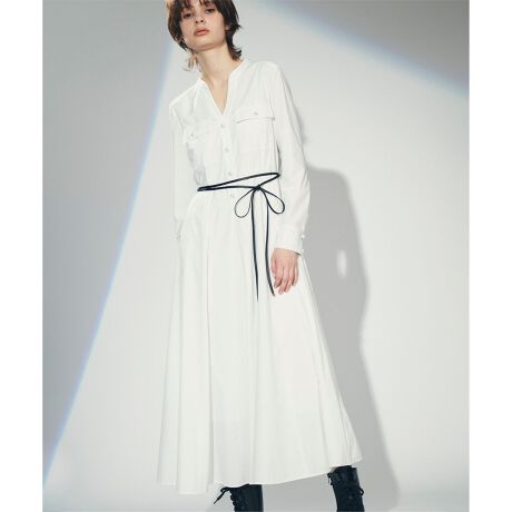薄手で落ち感のあるレーヨンブレンドのシャツ地でお作りしたワンピース。上身頃はややコンパクトですっきり、スカートは生地をたっぷり使用した贅沢なフレアシルエット。綺麗なドレープ感が美しく、歩く度に優しく揺れ動くフェミニンな一枚です。付属のベルトでウエストマークをすれば、メリハリのあるシルエットを楽しめます。胸元はすっきりとしたスリットネックを取り入れて、大人っぽく上品な印象に仕上げました。