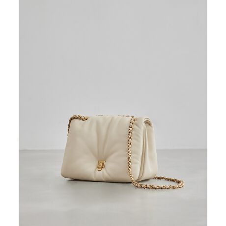 トレンドの中綿が入ったパフィーシルエットがポイントのショルダーバッグです。あえてキルト加工をせず、ふっくらとしたシルエットを強調したミニマルなデザインに仕上げました。オリジナルのロック金具はRPロゴをあしらっています。チェーンと金具はブラスカラーのコーティングを施すことで上品で高級感のある雰囲気に。