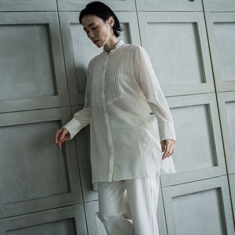 一枚でもジレのレイヤードにも着まわしていただけるチュニック丈ブラウス。