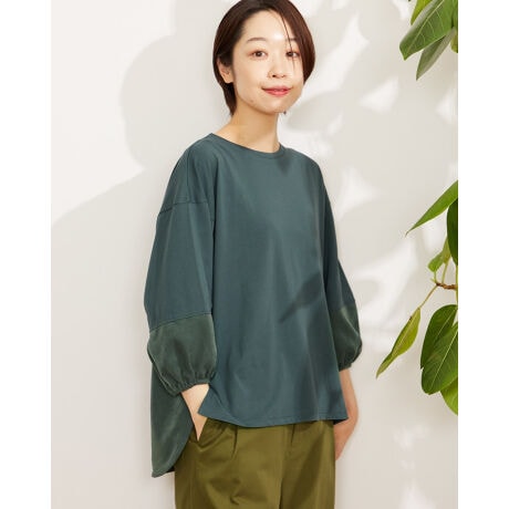ポリエステル素材とカットソーを切り替えたデザイントップス。異素材の組み合わせのコントラストが効いたアイテムです。同系色の切り替えで3色展開作りました。