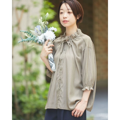 マットでしなやかな生地には小さく織り込んだドットが並び、光を反射し時々光る様子がとても綺麗。襟元に通したヒモをキュッと絞るとフリル状になった襟が立ち上がりとても華やかに。フロントで軽く蝶結びにしてお召ください。フェミニンな雰囲気なのでオフィスや在宅業務での着用もおすすめ。気温に応じてカーディガンやジレを羽織ってもOK。ボタンを全て開け羽織る時は襟をゆるく絞り小さく隆起させると顔回りに立体感が出て可愛い表情に。柔らかく女性らしさがある為、綺麗めなボトムスの他、カジュアルなアイテムとのミックスコーディネートも素敵です。