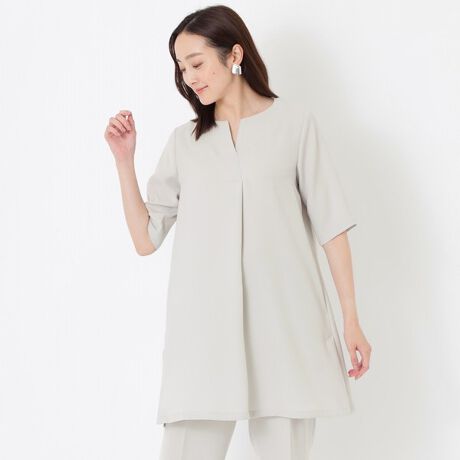 キーネックデザインがポイントの5分袖チュニックプルオーバー。