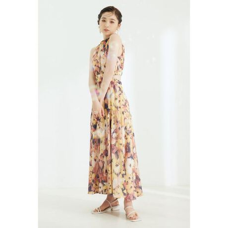 【ホルターネックのデザインがヘルシーさと今っぽさを引き立てるワンピース】【Design】ギャザーを効かせたネックとウエストから広がるフレアシルエットが、女性らしさをトレンド感を引き立てるワンピース。襟とウエストはぐるりゴム仕様なので、ファスナーも無く簡単に着脱出来るのが嬉しいPoint。ホルターネックにする事で、上から下へ向かって三角形のシルエットを作り、自然と美しいバランスに魅せてくれます。フロントから自然と背中に向かって開いたウエストのデザインが、今時な肌見せを叶えます。さらっとした素材感でこれからの時期にリラックスして着られるお勧めのアイテムです。【Color】柄と無地の展開で、それぞれ素材を変えています。無地は自然なワッシャーがかった織りの生地感で、凛とした印象を与えるIVOY、モードかつ女性らしさ引き立つBLK。柄はさらっとしたシルキーなタッチが大人っぽい生地感で、上品な雰囲気が引き立つ柄BEG、爽やかで大人っぽさ引き立つ柄GRN、はっきりとした色合いが夏らしく華やかな柄NVY、の豊富な5色展開です。■透け感:無地⇒有し/柄⇒無し■光沢感:無地⇒無し/柄⇒やや有り■伸縮性:無地/柄共に無し■裏地:有り