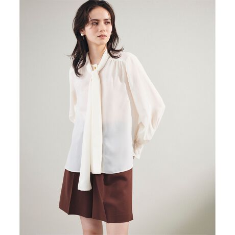 ほどよいふくらみ感のあるパウダリージョーゼットを使用した、フェミニンなボウタイブラウス。