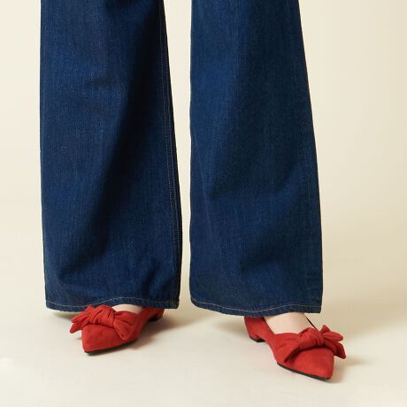 リボンモチーフはつま先を覆う大きめのサイズ感で存在感がありながらも、アシンメトリーにすることで甘さ控えめな一足に仕上がりました。