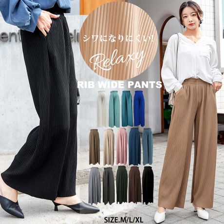 リピ続出!春プリーツリブワイドパンツ。形状記憶でシワしらず。ボトムス ハイウエスト ストレッチ