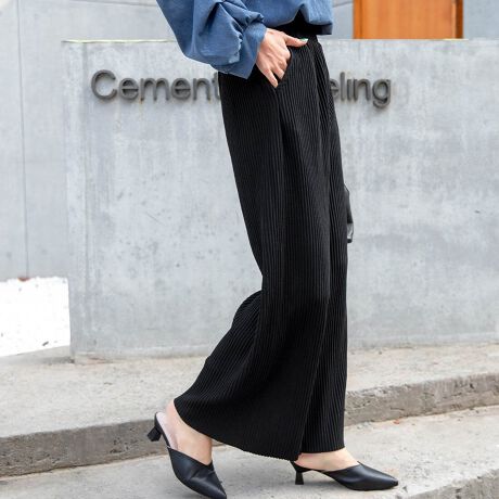 このプリーツマジックパンツは、縦ラインプリーツが美しいシルエットを演出しどんな体型でも美しく見せるデザインが特徴です。