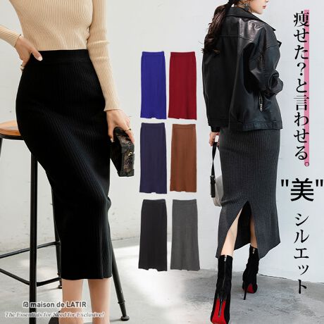 ハイウエストリブニットスカート★絶妙スリットで美シルエット!履き心地良い!