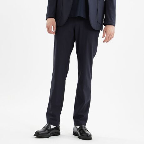 ベルトなしでも穿けるリラックスした着心地ながら前身はすっきりとした見た目のビジカジ兼用で使えるパンツ。裾にかけてテーパードを利かせてきれいなラインが出る設計にしています。