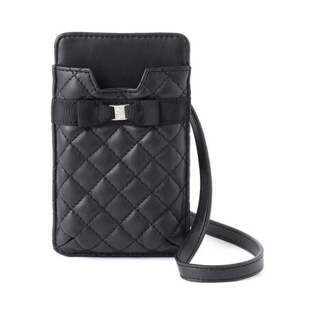 合皮にキルトステッチをかけた素材をベースにグログランリボンをあしらったエレガントなスマホポシェットです。前胴にスマホが入るポケット、背胴にはカードスロットと小銭などを入れることができるファスナーポケットがありコンパクトに収納できるポシェットです。ショルダーストラップは長さ調節が可能でナスカンで取り外せます。ショルダーストラップを外してバッグなどの中に入れて持ち運ぶこともできます。