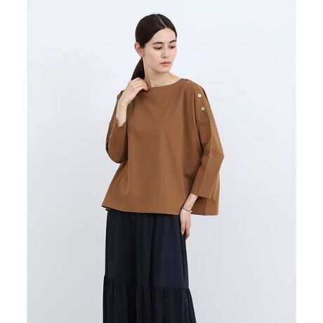 ドロップショルダーとゆったりしたAラインシルエットが特徴的なカットソー。肩には金ボタンのディテールが加わり、シンプルでありながらも女性らしさを際立たせてくれます。腕周りがゆったりているため、二の腕の細見え効果もあります。生地は超ハイゲージのポンチ素材で超長綿を使用しているため、滑らかな肌触りと光沢感、しなやかな落ち感があります。身体のラインを拾わないハリコシ感、適度なストレッチ、イージーケア性を持っています。・水洗い可