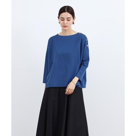 ドロップショルダーとゆったりしたAラインシルエットが特徴的なカットソー。肩には金ボタンのディテールが加わり、シンプルでありながらも女性らしさを際立たせてくれます。腕周りがゆったりているため、二の腕の細見え効果もあります。生地は超ハイゲージのポンチ素材で超長綿を使用しているため、滑らかな肌触りと光沢感、しなやかな落ち感があります。身体のラインを拾わないハリコシ感、適度なストレッチ、イージーケア性を持っています。・水洗い可