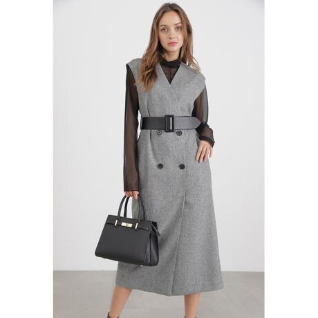 マスキュリンな雰囲気漂うダブルブレストワンピース。胸元は深めのVカットラインがシャープ見えし、ダブルブレストのディティールがクラス感漂うワンピース。タイト過ぎないややゆったり目のシルエットですが後ろウエストダーツですっきりとしたシルエットに仕上げています。ウエストでマークしたフォーレザーベルトがスタイリングにメリハリを与えます。シアーブラウスやハイゲージニットとのレイヤードスタイルがおすすめ。フロントボタンを外すとジレとしても素敵に着用していただけます。