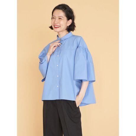 ・シンプルながら、女性らしさもプラスしてくれる袖ギャザー5分袖シャツ。