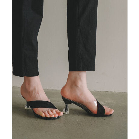 旬のPVC素材でヌーディーな足元をつくる変形ヒールスクエアトゥサンダル。<br>スリッパ感覚でさっと履けて気楽なのに決してラフじゃない、洒落感抜群のサンダルです。<br>今っぽ靴の代表デザインであるスクエアトゥ。<br>つま先の直線的なデザインが着こなし全体をモードハンサムに着地させてくれます。<br><br>■素材<br>合成皮革<br><br>■注意事項<br>・お使いのモニターや端末により、質感・色合いが実際の商品と異なって見える場合がございます。<br>・表記サイズは測り方によって1?2cmの誤差が生じる場合がございます。ご了承くださいませ。