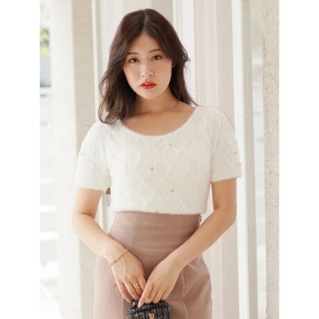 [型番:000435010370]ラインストーンやパールを散りばめて、ラグジュアリーに仕上げたハーフニット。立体感のあるケーブル模様も上品で大人っぽい印象を与えてくれます。デコルテが映える広めのラウンドネックも女性らしさを引き立たせるさりげないポイントに◎コーディネートに取り入れるだけでも、スタイリングをクラスアップしてくれる華やかな1着です。