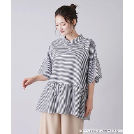 爽やかなストライプ柄がクリーンに映える、襟付きブラウス。ふわりとしたフレアスリーブやヘムがインパクトを放つ、オーバーサイズのシルエットでデザインしました。スリーブとウエスト周りを切り替えることでストライプの向きに変化を作り出しています。切り替え部分にはギャザーを施し、柔らかなニュアンスに。バックファスナーには長めのコードをあしらい、着脱のしやすさをサポート。細身のパンツでまとめると好バランスなコーディネートが完成します。------------------------------------初秋なしなしなしやや薄手ウォッシャブル(手洗い可)なし-------------------------------------※商品の色味は、撮影場所や光のあたり具合、お客様のお使いの機器により色味が違って見える場合がございます。予めご了承ください。 ※定価(税込)は、2024年1月2日のセール開始前の店舗における販売価格です。