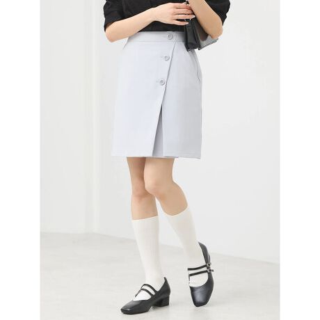 サイドにボタンを施した、ラップ風デザインのミニスカート。