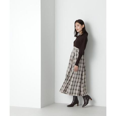 [design & styling]ドルマンスリーブニットとチェック柄フレアスカートを組み合わせた、コンビネーションワンピース。ドルマンスリーブで、二の腕をカバーしながら華奢見せさせ、ハイウエスト切り替えのスカートでスタイルアップ効果も期待できます。後ろウエスト部分にゴムが入っているので程よいフィット感とリラックス感のある着心地です。左ファスナーで着脱[fabric]上身頃は程よいフィット感のあるリブ編みニット、スカート部分はフレアラインがきれいに広がる布帛を使用しています。※裏地あり※モデルの着用画像の場合、光の当たり具合により、実際の色味と異なって見えることがございます。色味は、商品アップの画像をご参照ください。