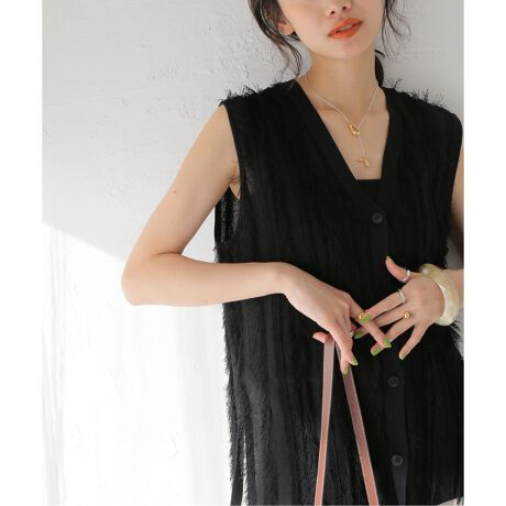 肌離れよいドライな質感のニットベスト。トレンド感あるフリンジジャガード編が新鮮な着こなしに。