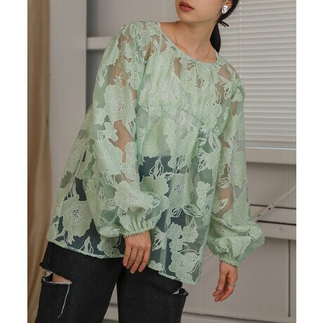 シアーフラワー柄が目を惹くボリュームスリーブのデザインブラウスが登場です。胸元の高い位置の切り替えでスタイルアップと裾広がりのエアリーなシルエットが女性らしく、且つ気になる腰回りをカバーしてくれます。袖口にはゴムを施しているので、袖丈の調節もでき長い間着用いただけます。