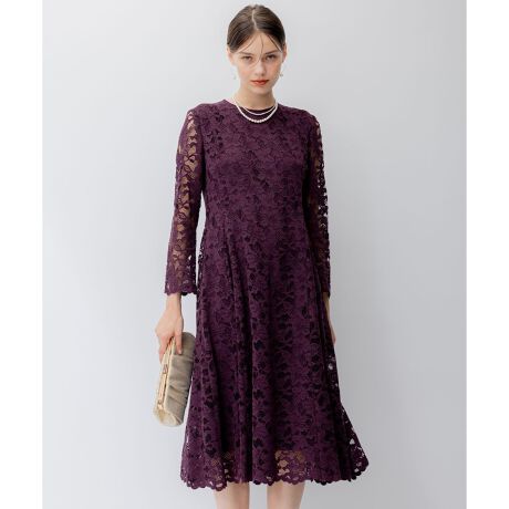 華やかな花柄総レースのドレス。1枚できれいなシルエットに決まるデザインと繊細なレースが華やかさを演出してくれます。フェミニンなニュアンスのライトグレー(#003)、雰囲気のあるパープル(#080)、シンプルで上品なネイビー(#075)の3色展開です。